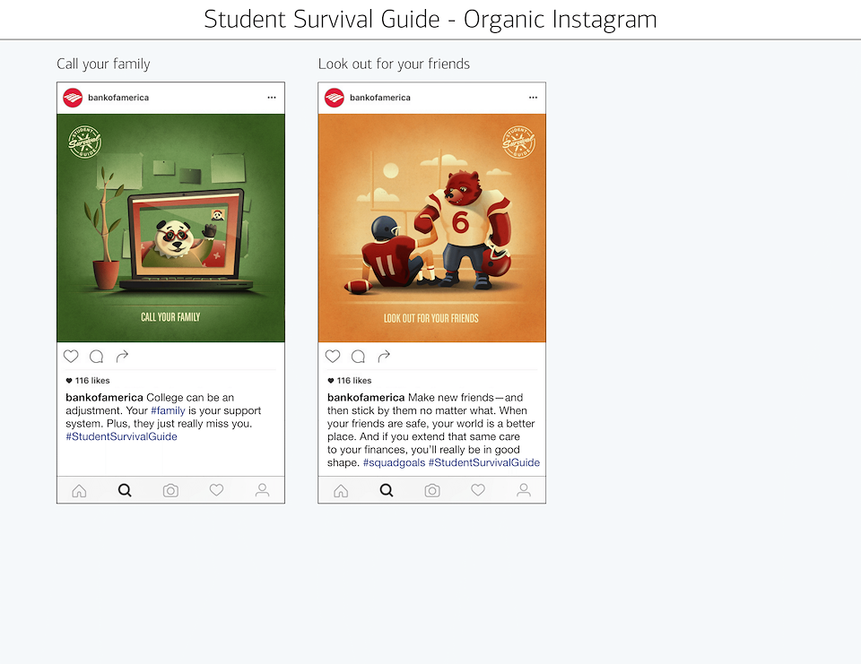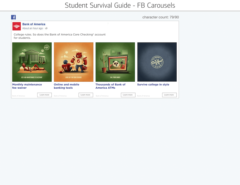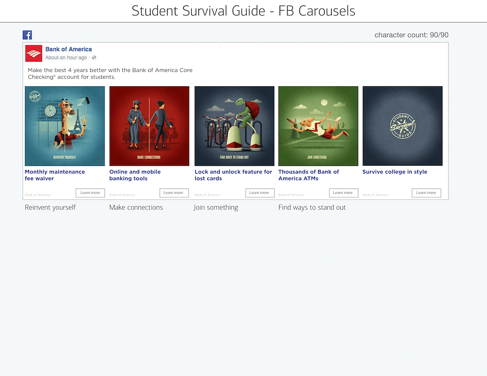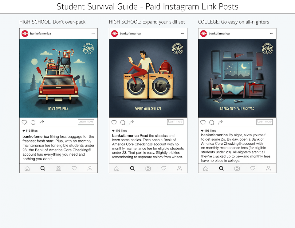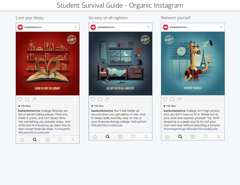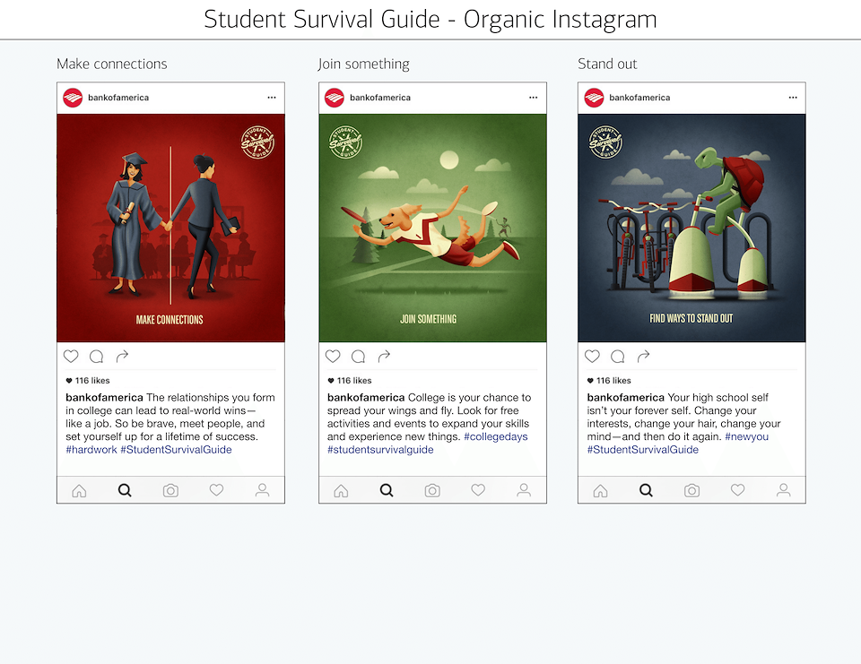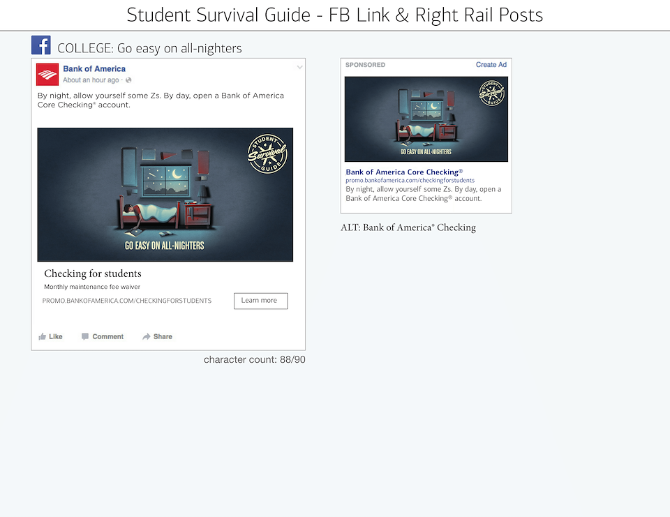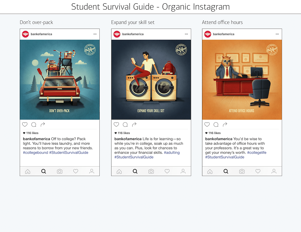 My team and I crafted this campaign from start to finish to promote Bank of America’s checking account for college students. The survival guide theme was inspired by old camping materials, and we worked with a talented illustration team to bring our ideas to life. I learned that you can communicate a message clearly and funly (a word!) even in the face of extremely long legal copy and Twitter character limits.